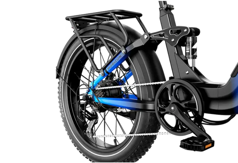 Along with the front suspension, the Horst-link suspension completes the Heybike Horizon is full suspension system. It greatly reduces bumps on uneven surfaces, providing a smoother, more controlled ride.